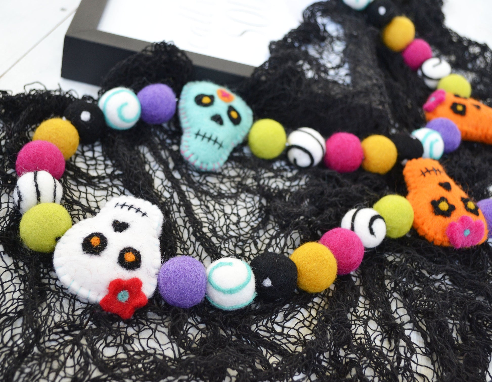 Dia De Los Muertos Felt Garland - Day of the Dead Garland, Felt Ball Garland, Dia De Los Muertos Decor, Sugar Skull, Skull Garland