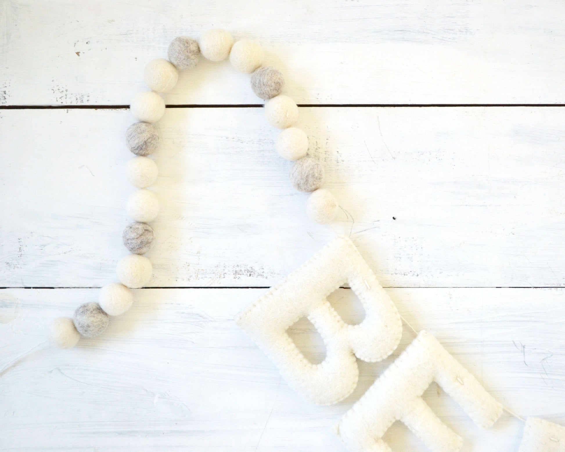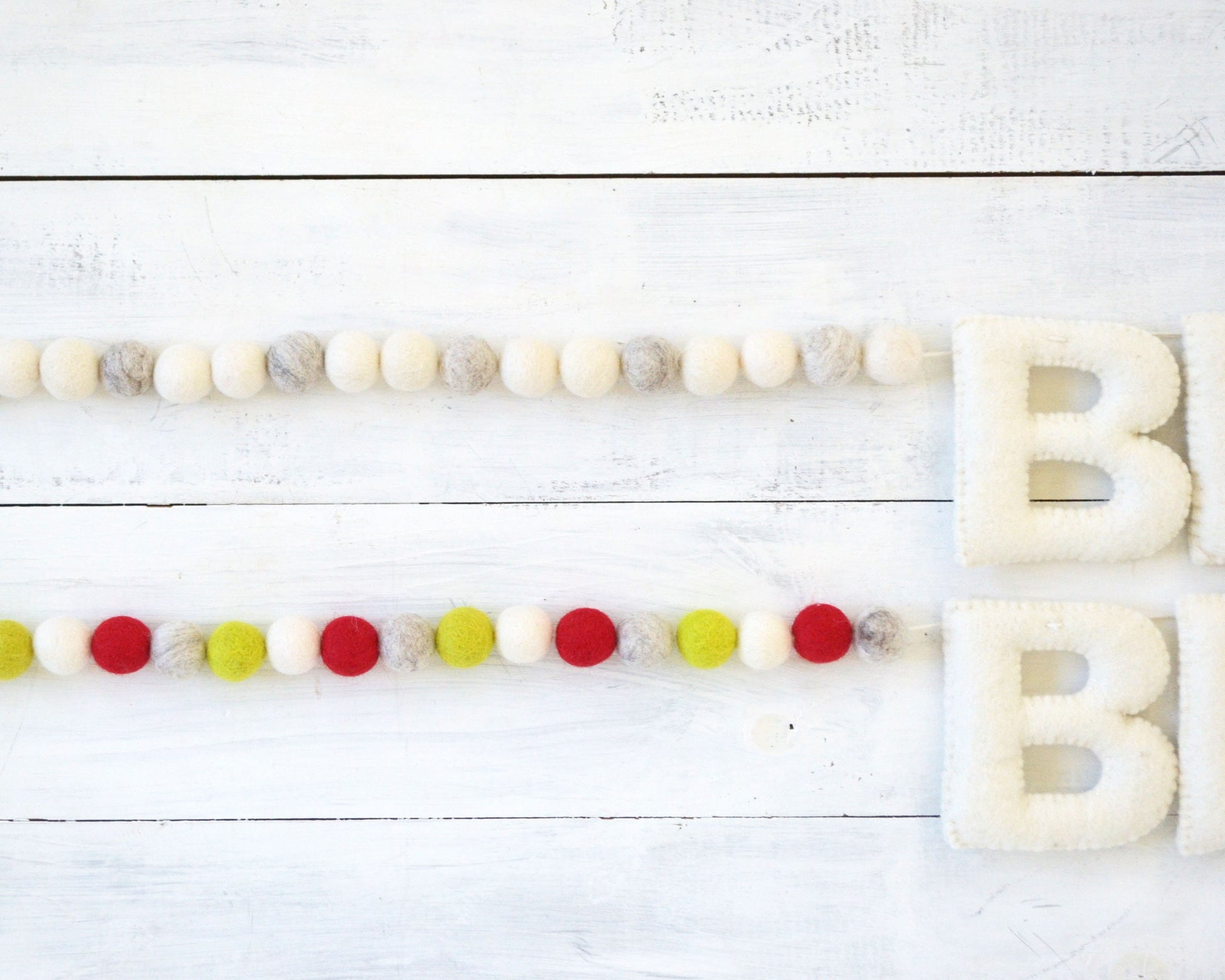 Our wool felt ball & ivory felt letter garland is the perfect accent for your mantel, children's room, Christmas tree, holiday decor and home decor. Each felt ball measures approximately 1" and is strung on coordinating bakers twine. Because we love the fullness and look of all the balls strung side by side, we have designed them this way with wool felt letters in-between.