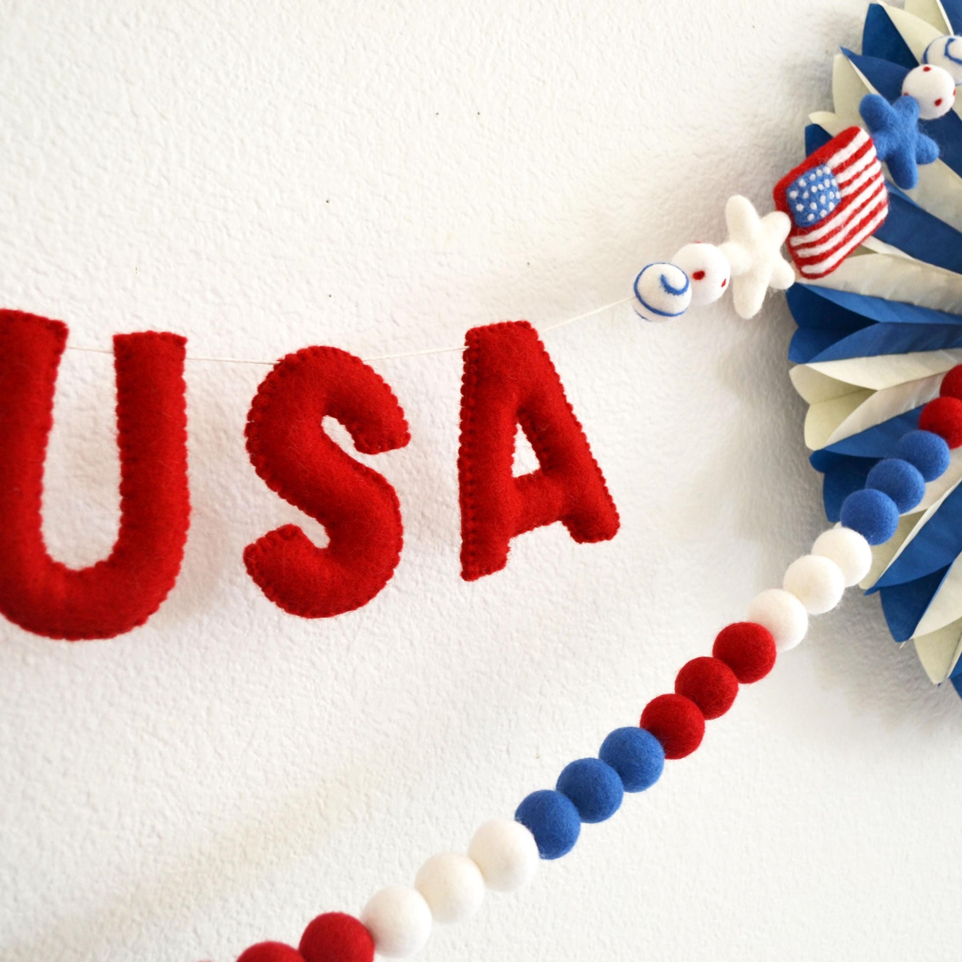 4th of July Felt Garland - Choice of USA or Red, White & Blue Ombre Felt Ball Garland
