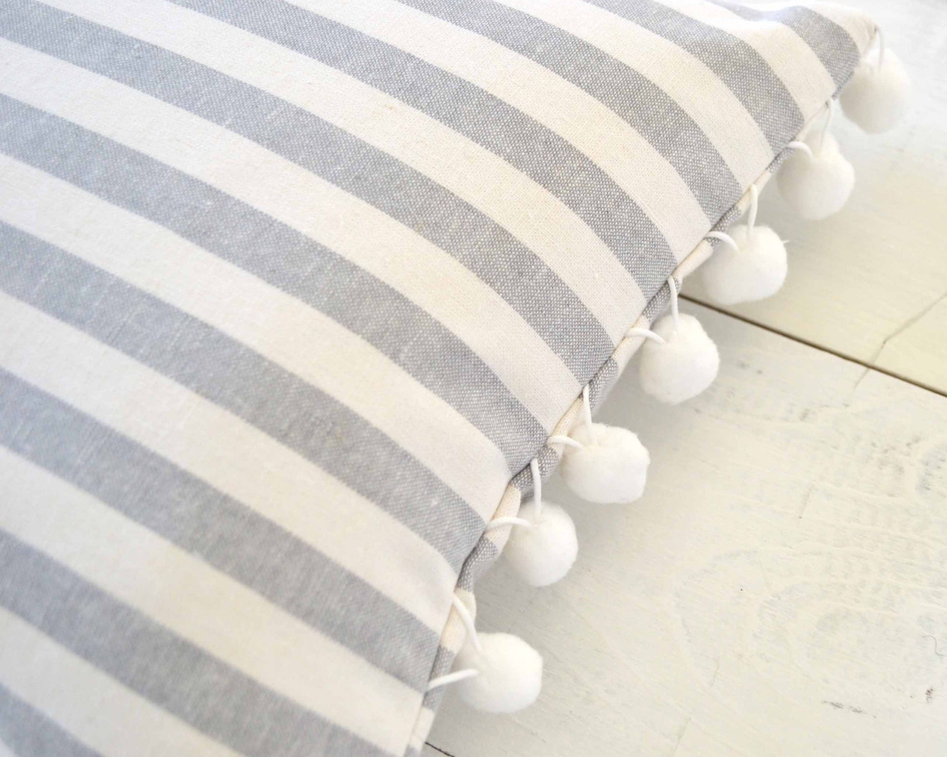 Our gray and white striped pillow cover with white pom pom trim is a perfect addition to your home.