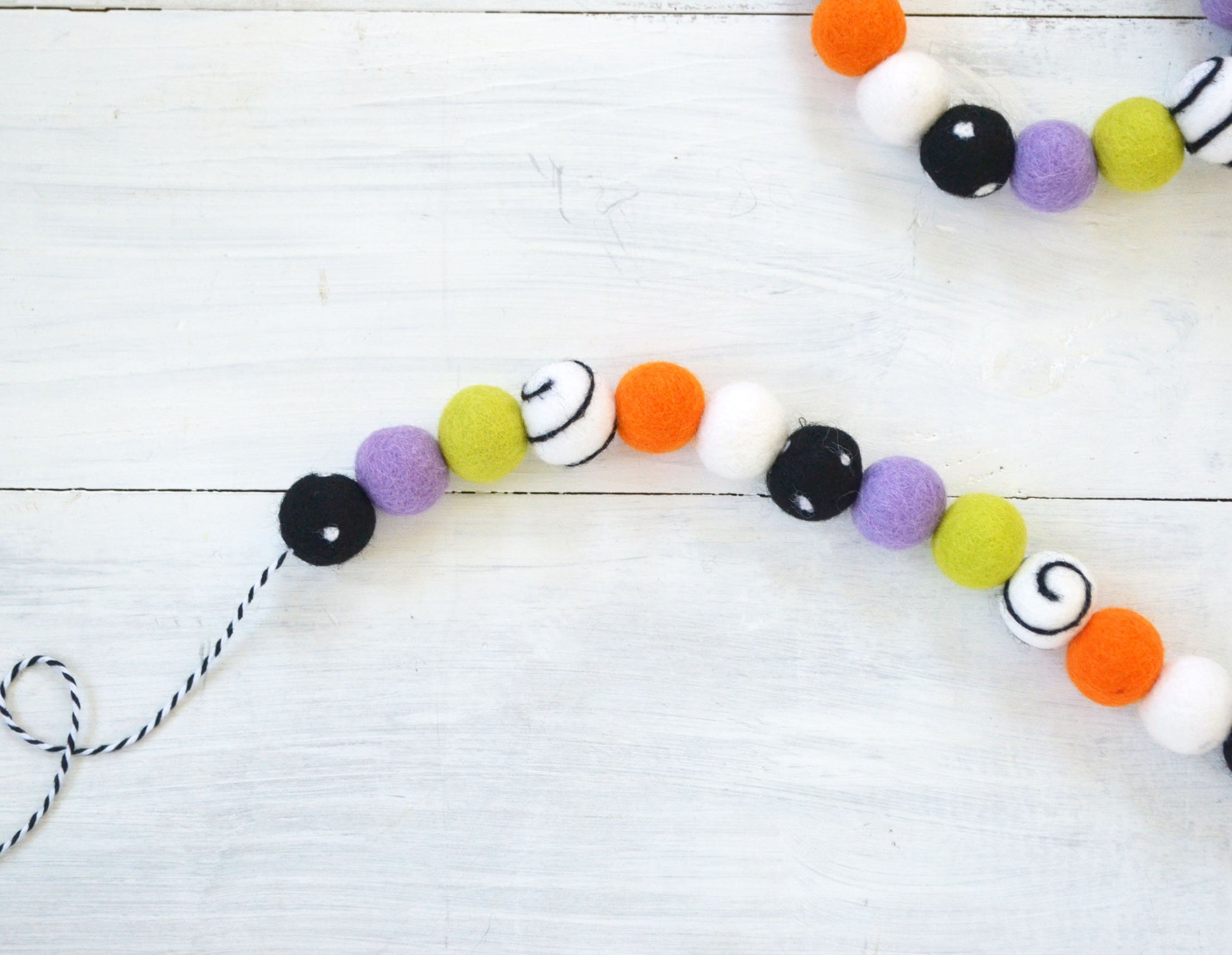 Our wool felt ball garland is the perfect accent for halloween party decor, children's bedroom, kid's teepee, playhouse, playroom or home decor. Each felt ball measures approximately 1" and is strung on twine. Because we love the fullness and look of all the balls strung side by side, we have designed them this way. Additional twine is left for each ball to be easily moved and spaced to your desired width by sliding left or right. A small loop on each end allows garlands for easy hanging.