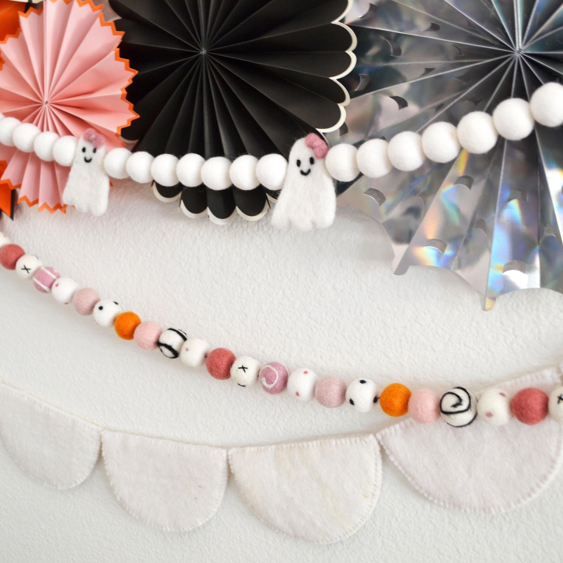 Halloween Felt Ball Garland - Ghost Felt Ball Garland, Halloween Garland, Ghost Banner, Black and White Felt Ball Garland, Ghost Garland
