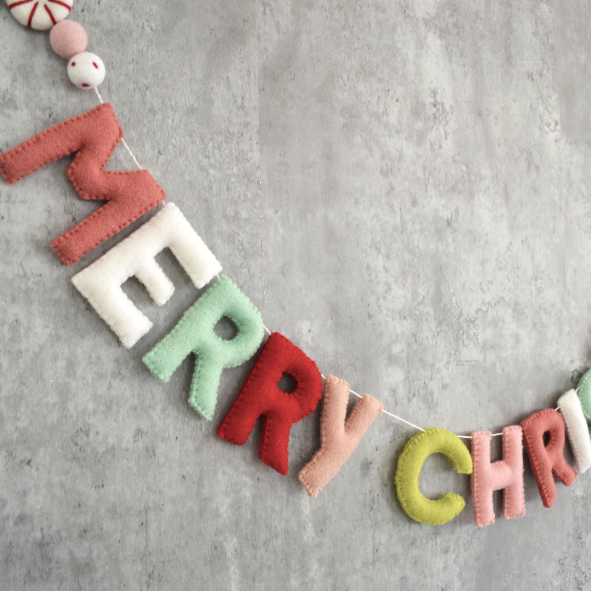 Merry Christmas Felt Banner with Wool Christmas Tree, Peppermint and Star