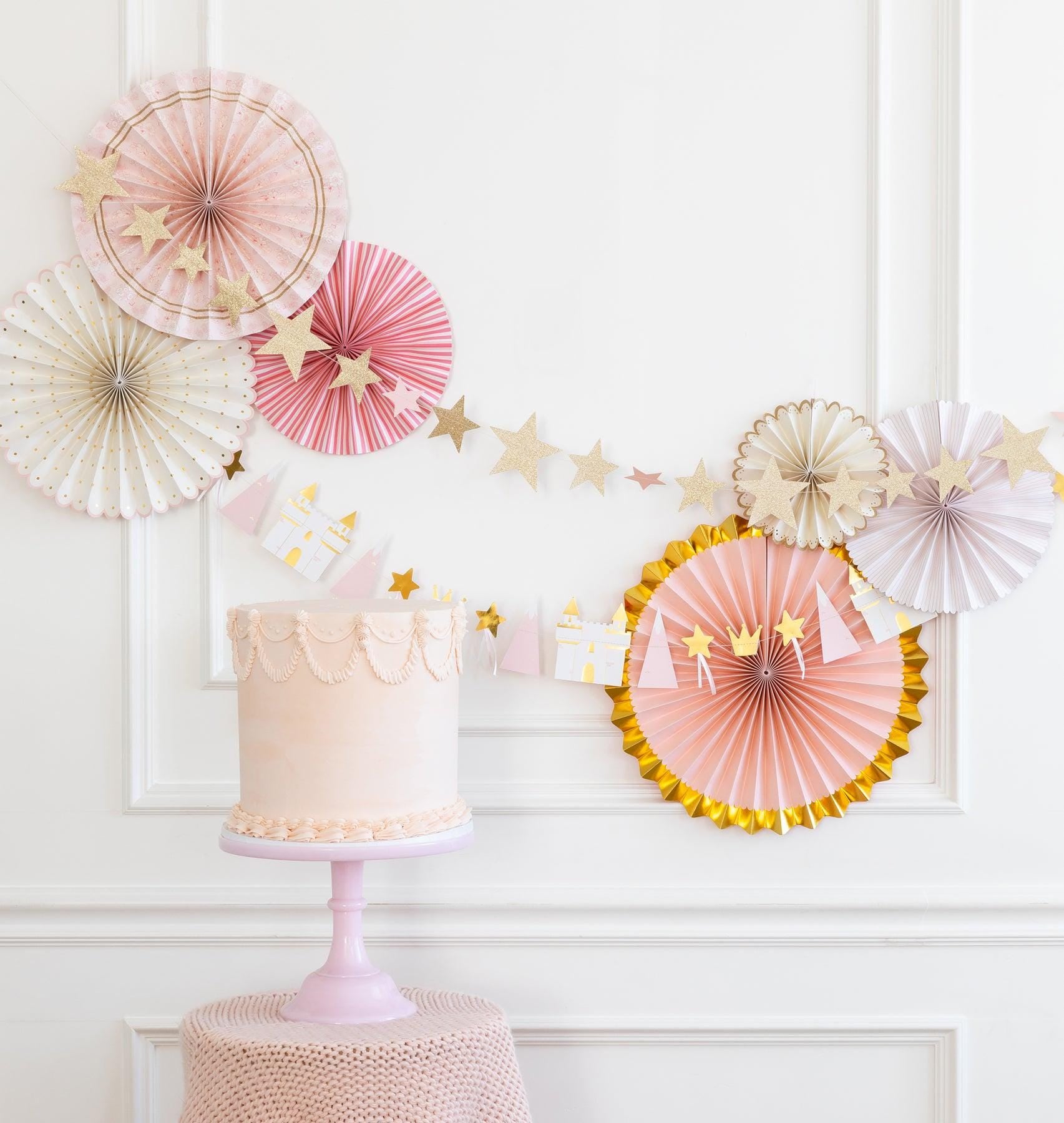These paper party fans are the perfect addition to any birthday, baby shower, tea party, or Valentine's Day celebration. With soft shades of pink, gold and cream they are sure to create a soft sparkling backdrop for your sweetie.