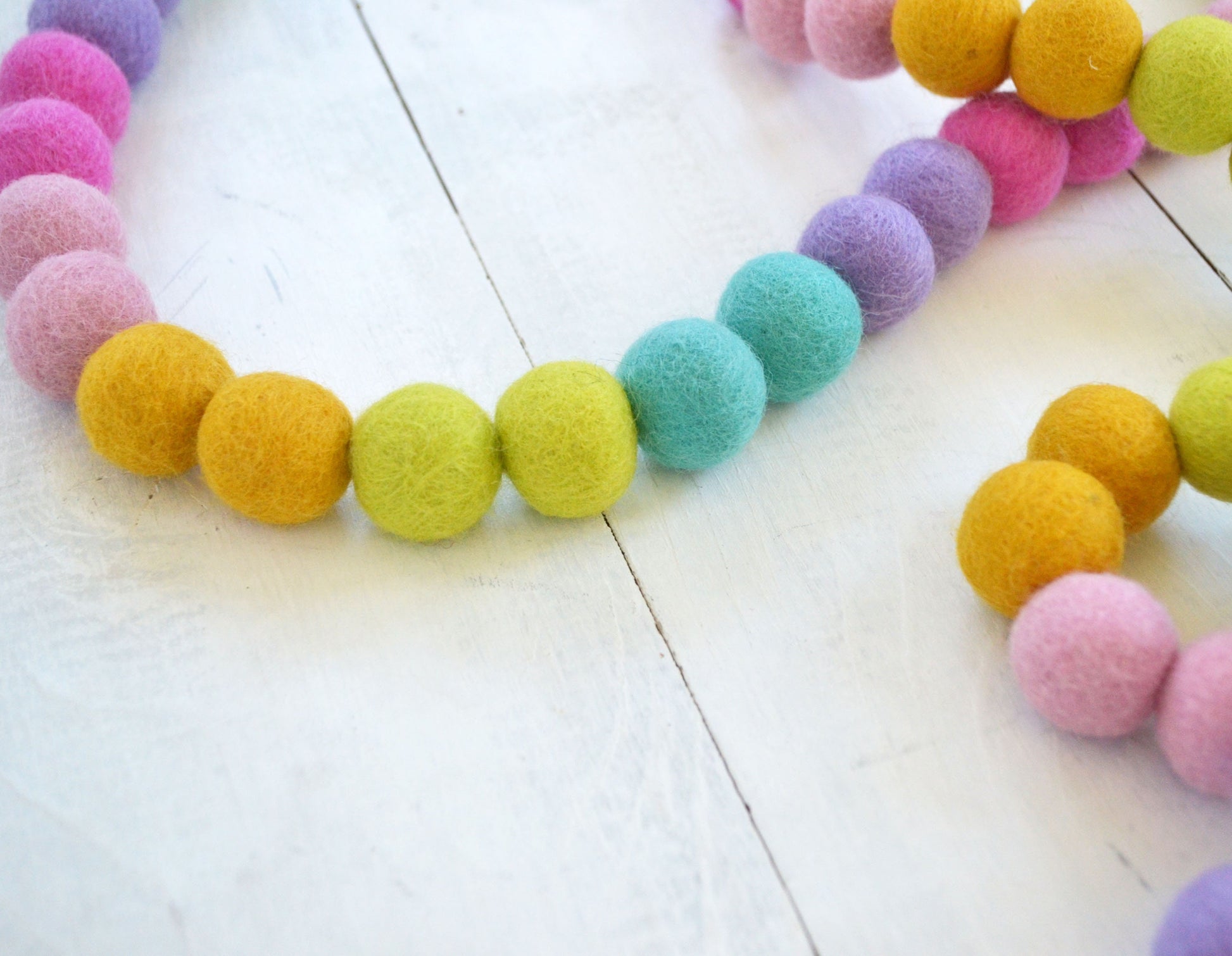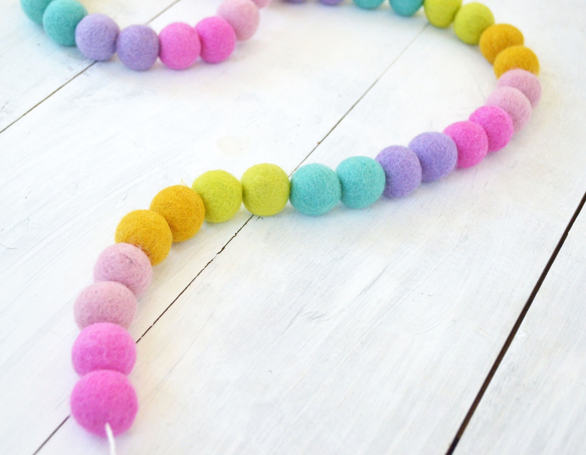 Our wool felt ball garland is the perfect accent for birthday party decor, children's bedroom, kid's teepee, playhouse, playroom or home decor. Each felt ball measures approximately 1" and is strung on twine. Because we love the fullness and look of all the balls strung side by side, we have designed them this way. Additional twine is left for each ball to be easily moved and spaced to your desired width by sliding left or right. A small loop on each end allows for easy hanging.