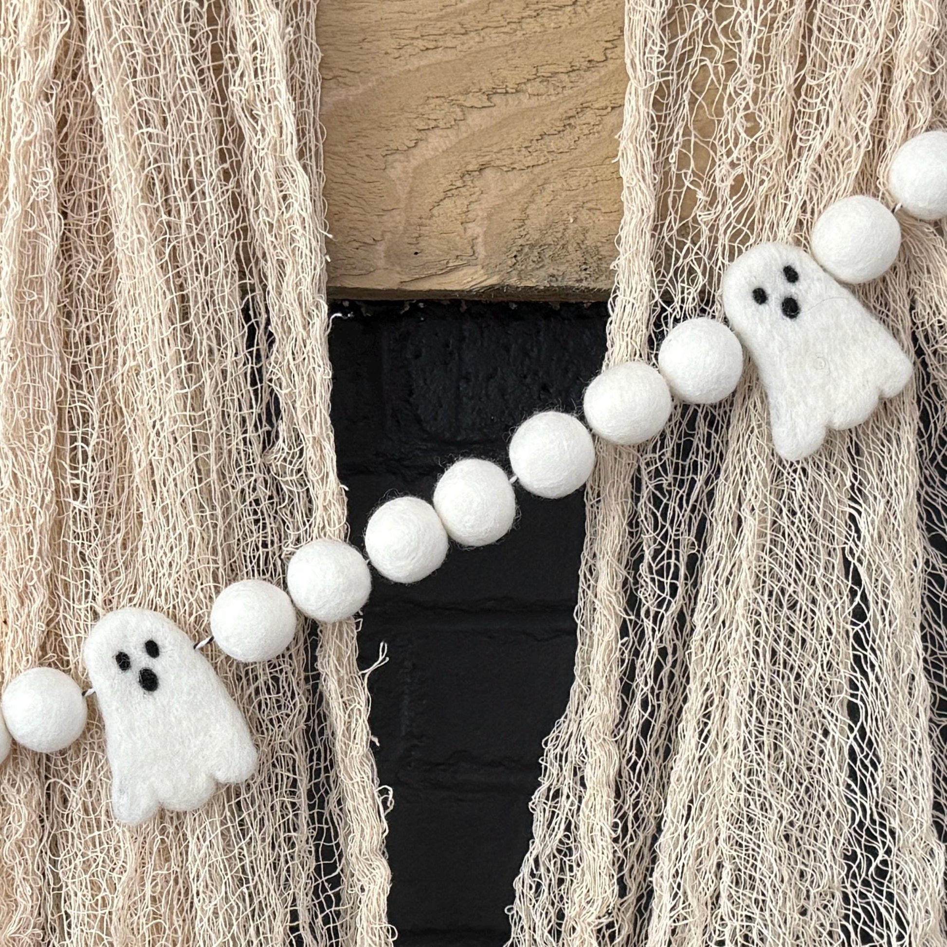 • 7 ft. length includes 6 ghost and 49 felt balls. Felt objects side by side measures app. 5 ft. with approx. 12 inches additional twine on each side.