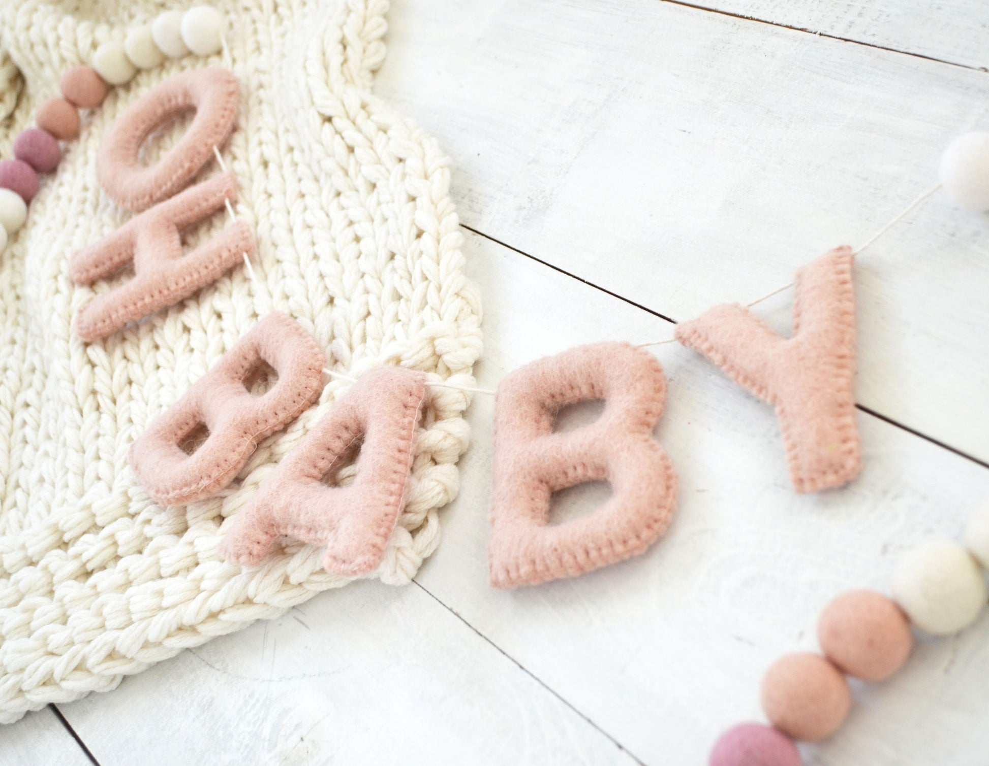 - Felt ball colors include white, ivory, peach, blush and light pink with blush felt letters in-between.