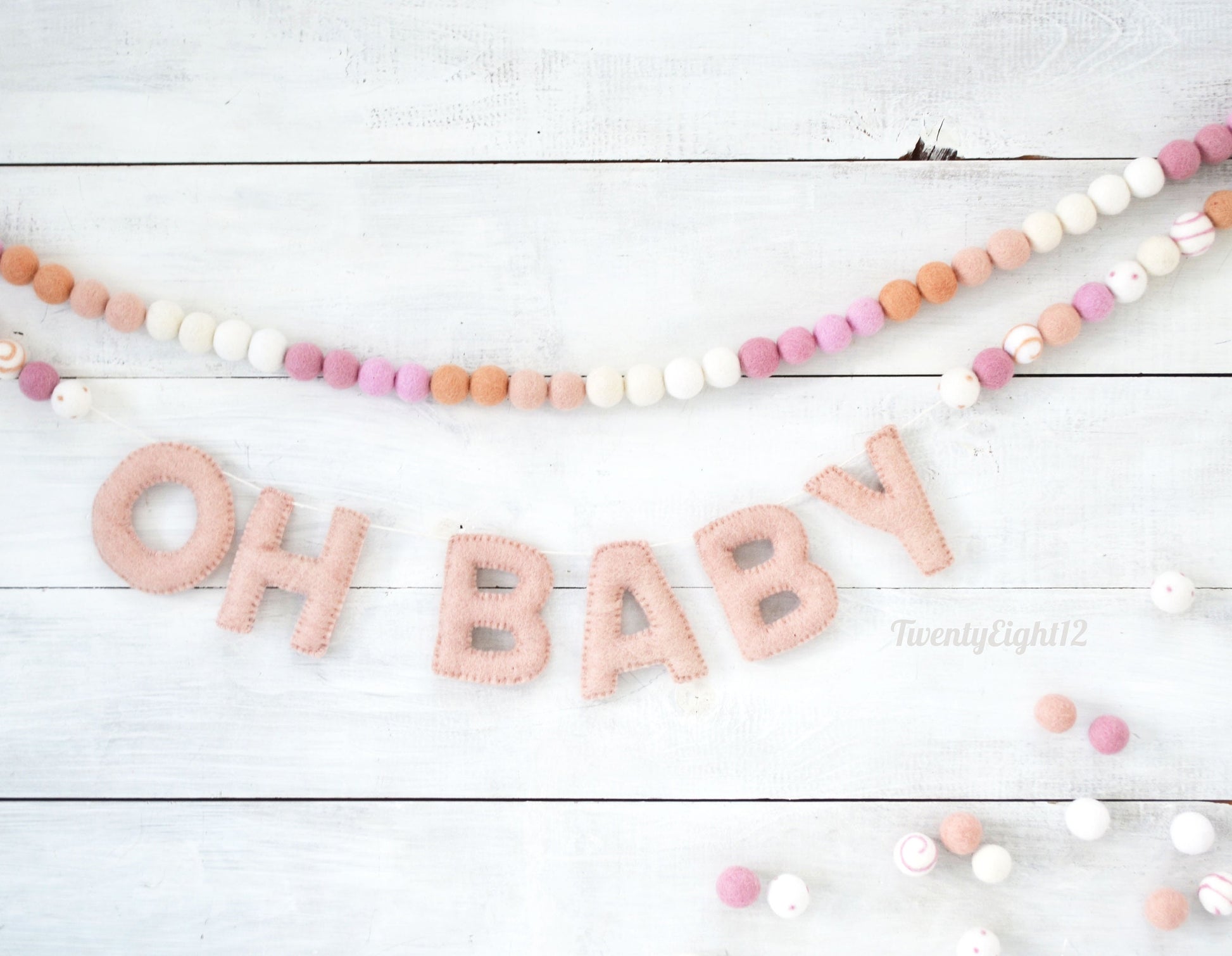 - Felt ball colors include white, ivory, peach, blush and light pink with blush felt letters in-between.