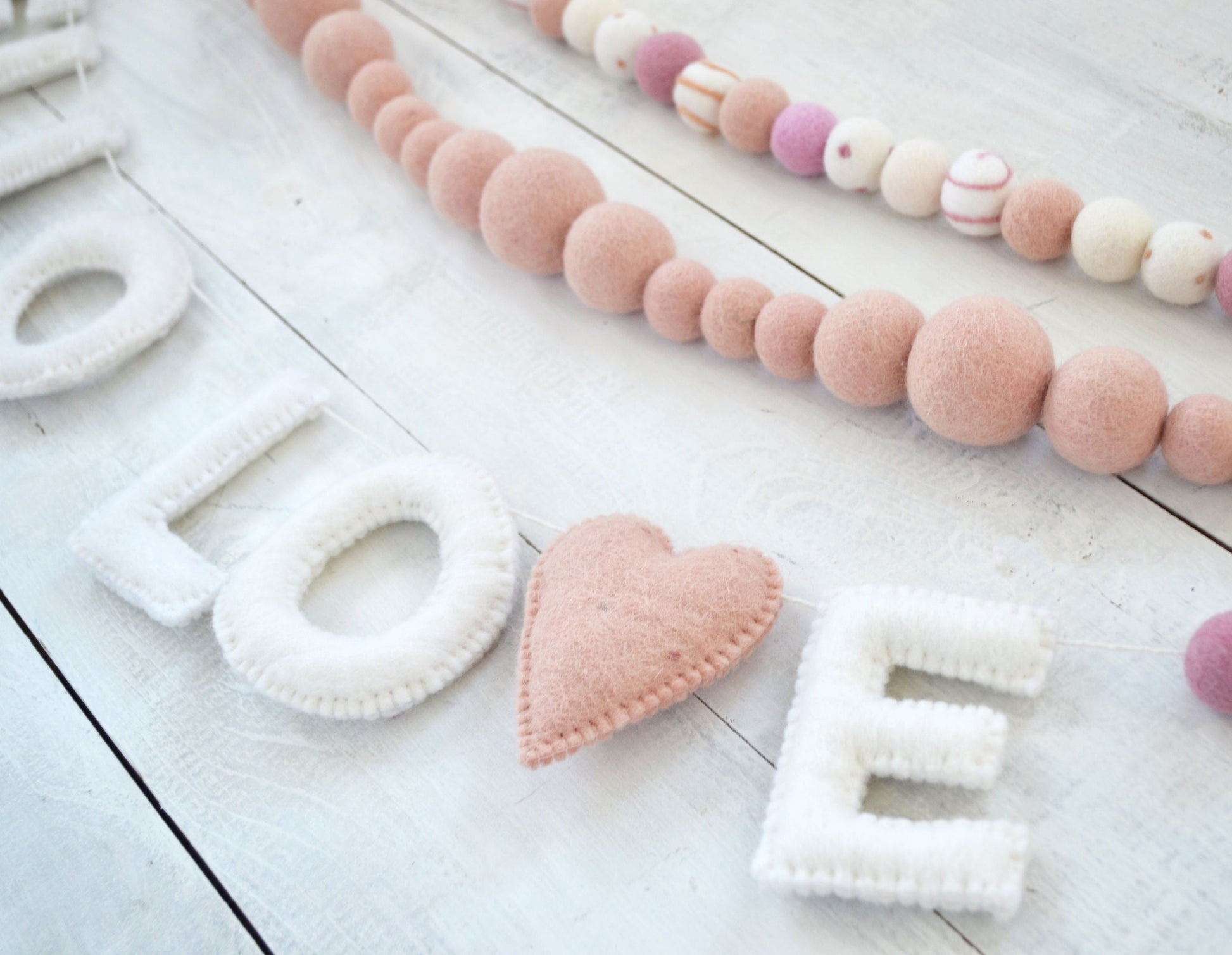 - Felt ball colors include white, ivory, peach, blush and light pink with white felt letters in-between.