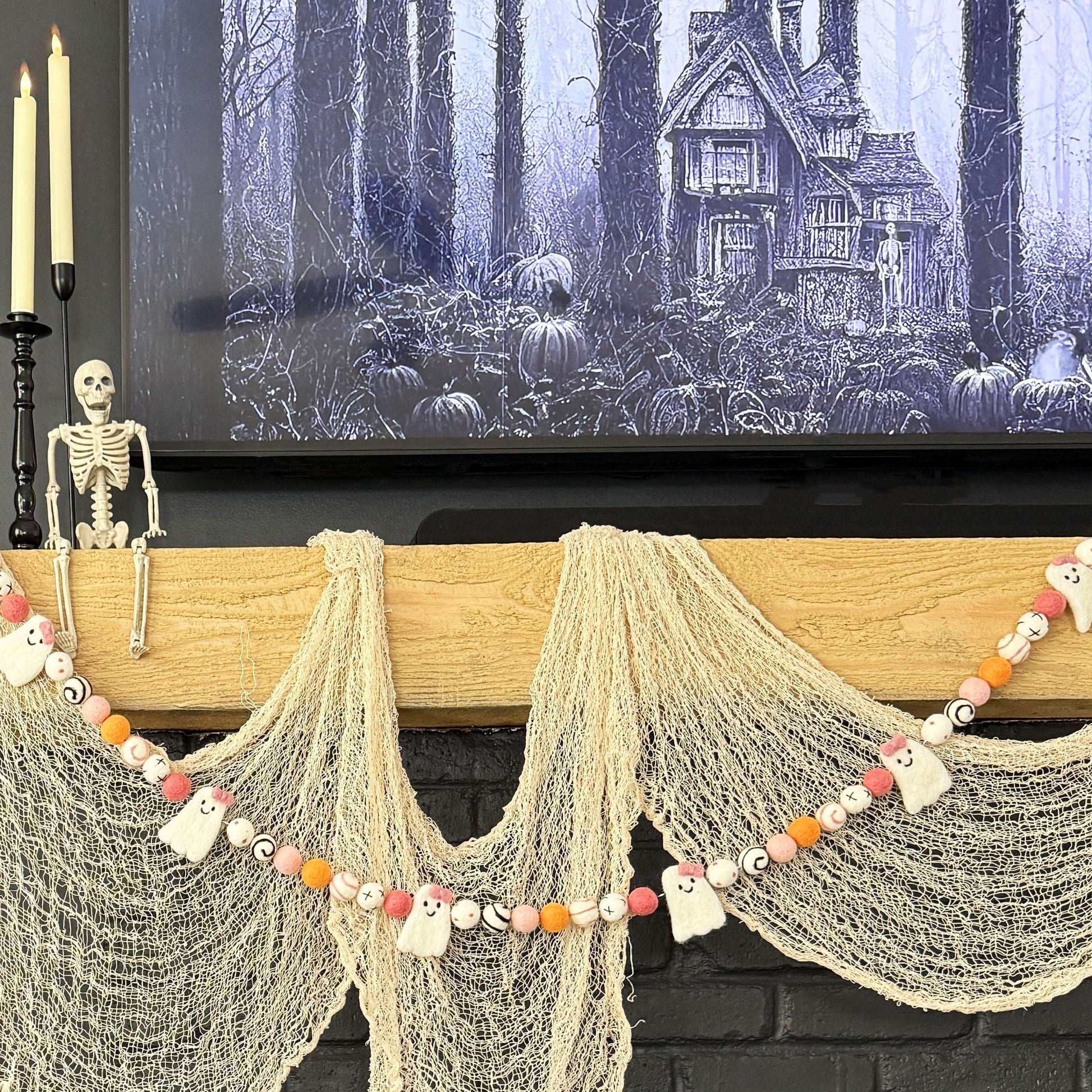 • 5 ft. length includes 3 ghost and 28 felt balls. Felt objects side by side measures app. 3 ft. with approx. 12 inches additional twine on each side.